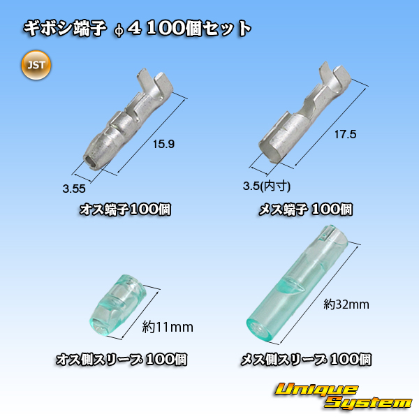 [JST Japan Solderless Terminal] bullet-terminal φ4 100pcs set / male & female terminal, male & female-side sleeve 100pcs each (400pcs in total) [GIBOSHI-4SET]