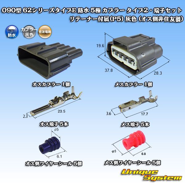 [Sumitomo Wiring Systems] 090-type 62 series type-E waterproof 5-pole coupler type-2 & terminal set with retainer (P5) (gray) (male-side / not made by Sumitomo)