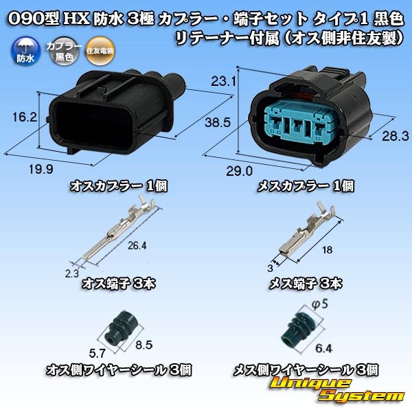 [Sumitomo Wiring Systems] 090-type HX waterproof 3-pole coupler & terminal set type-1 (black) with retainer (male-side / not made by Sumitomo)
