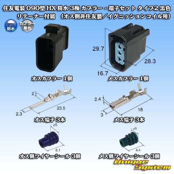 [Sumitomo Wiring Systems] 090-type HX waterproof 3-pole coupler & terminal set type-2 (black) with retainer (male-side not made by Sumitomo / for ignition coil)